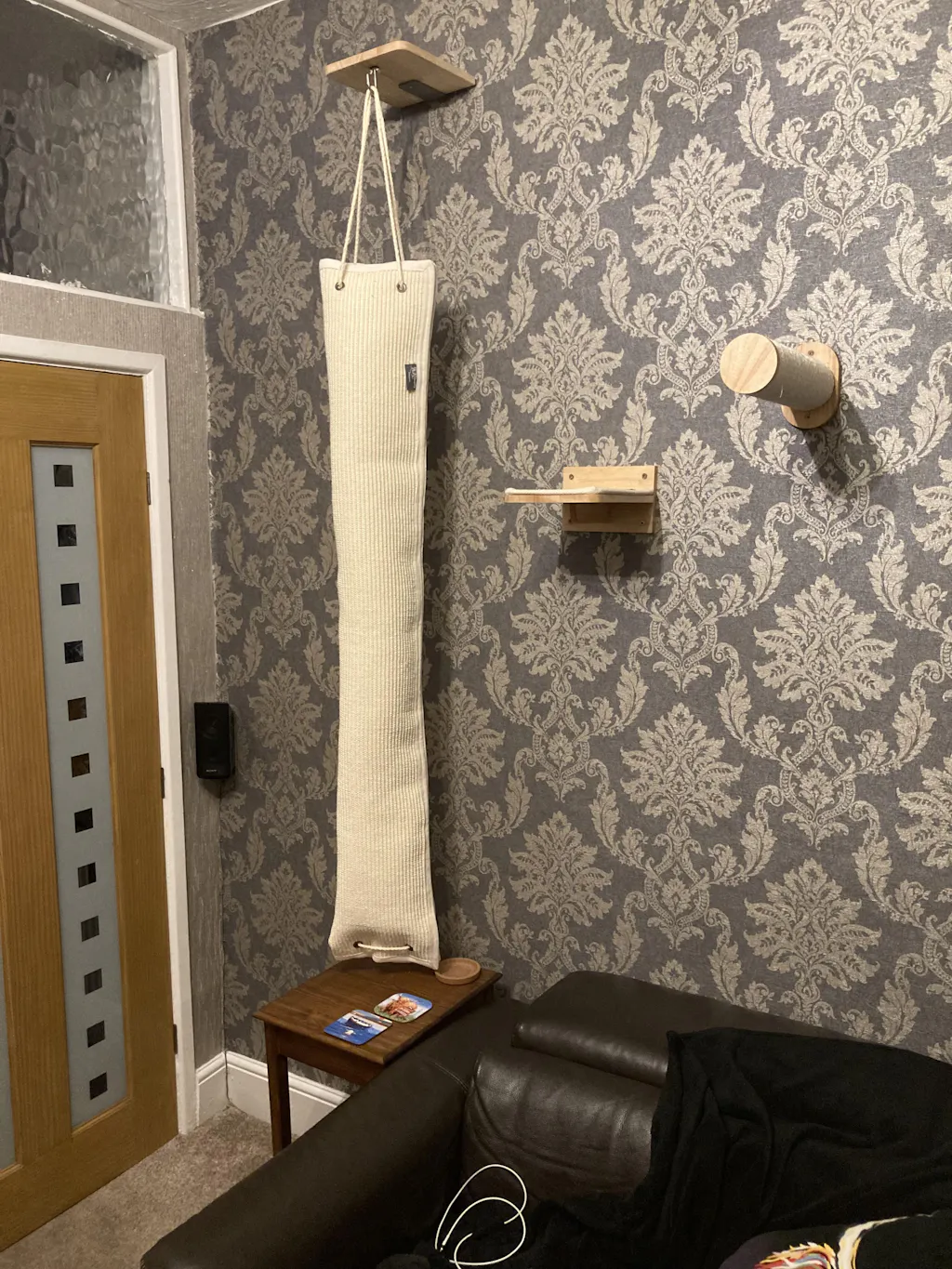 This cat wall climbing bag can be placed at any height on a wall and has a total height of 210cm. The climbing bag itself is 150cm high and 16cm in diameter. The bag is made entirely of strong sisal cloth and your cats can climb and play in it. The total depth (measured from the wall is 30cm).